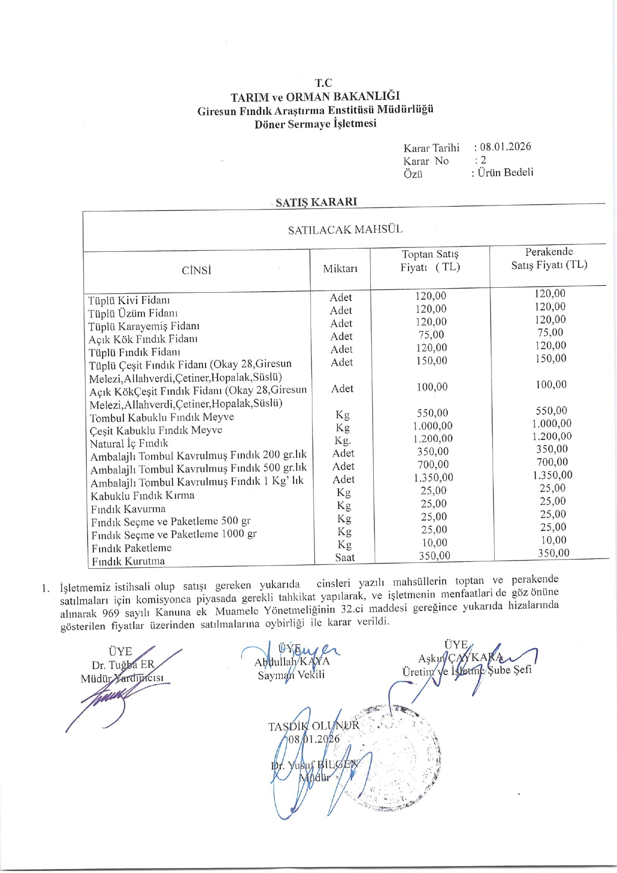 Döner Sermaye İşletmesi Güncel Ürün Bedeli