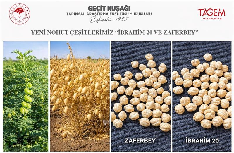 Enstitümüz tarafından yürütülen çalışmalar kapsamında geliştirilen “İbrahim 20" ve “Zaferbey" beyaz leblebilik nohut çeşitleri, 30 Mart 2026 itibarıyla tescil edilmiştir. Orta erkenci yapıları, yüksek verim potansiyelleri ve özellikle kurak koşullara uyum kabiliyetleriyle öne çıkan çeşitlerimiz, leblebi üretimine uygun özellikleriyle dikkat çekmektedir.