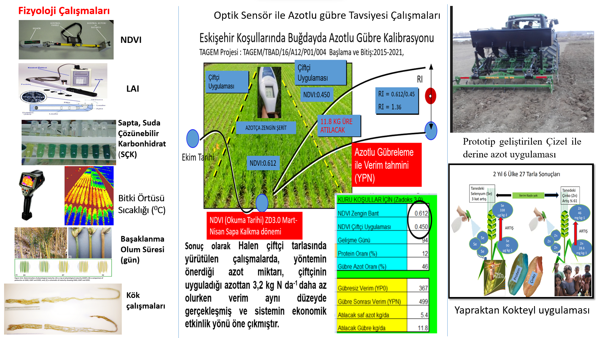 2007 yılında TÜBİTAK 1007 programı ile başlatılan ve TAGEM desteği ile devam eden proje çalışmaları tamamlanmış olup uygulamaya aktarılması noktasında çiftçi tarlalarında demostrasyon çalışmaları devam etmektedir. Pilot Bölge olarak seçilen Eskişehir'de gerçekleştirilen bu girişim, büyük olasılıkla yakın bir zamanda yurt sathına yayılacaktır. 2017 yılında Eskişehir'de 23 köyde yaklaşık 1200 dekar alanda İl Tarım ve Orman Müdürlüğü ile birlikte optik sensör ile azotlu gübre tavsiyesini içeren demonstrasyon çalışmaları çiftçi tarlalarında yürütülmüştür. Kuraklık fizyolojisi kapsamında; Enstitümüzde uzun yıllar parametre belirleme çalışmaları yapılmış ve devamında TAGEM desteği ile buğdayda kurağa toleransı yüksek olan yeni çeşitlerin geliştirilmesi amacıyla ıslah programına katkı sağlanmaktadır.