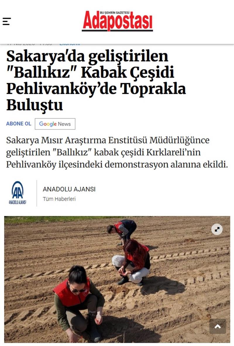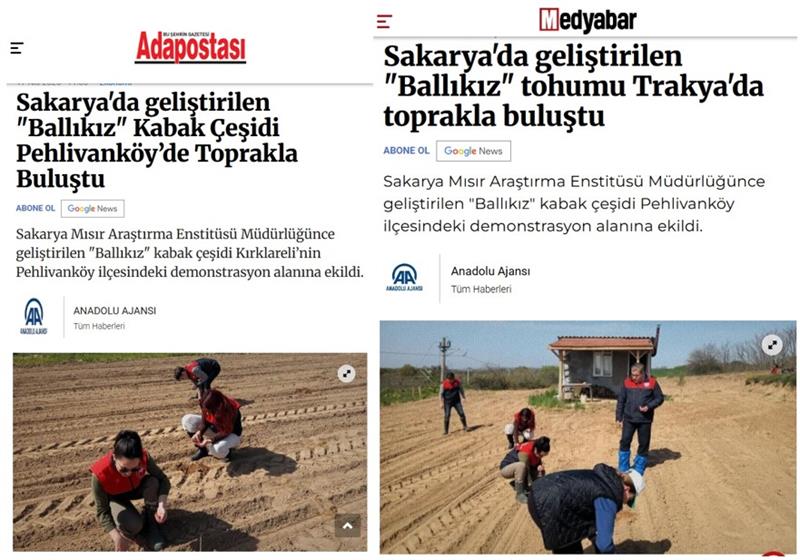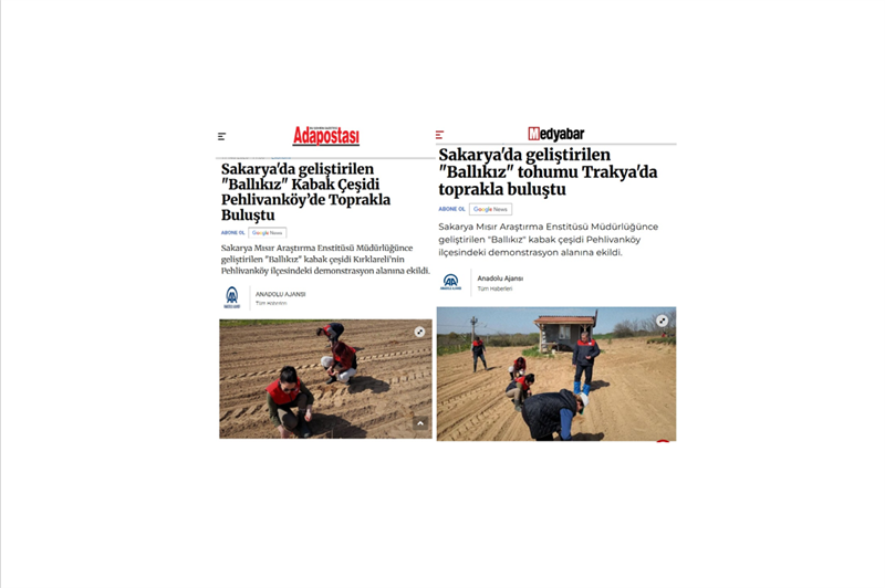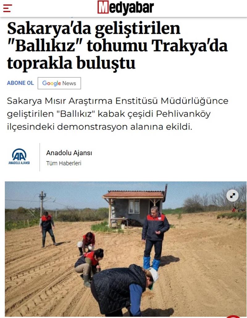 Sakarya Mısır Araştırma Enstitüsü Müdürlüğünce geliştirilen "Ballıkız" kabak çeşidi Kırklareli’nin Pehlivanköy ilçesindeki demonstrasyon alanına ekildi.