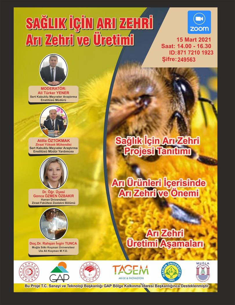 Enstitü Müdürlüğümüzce yürütülen GAP Bölge Kalkınma İdaresi Başkanlığınca desteklenen "Sağlık İçin Arı Zehiri" projesi kapsamında çevrim içi ortamda eğitim toplantısı düzenlenecektir.