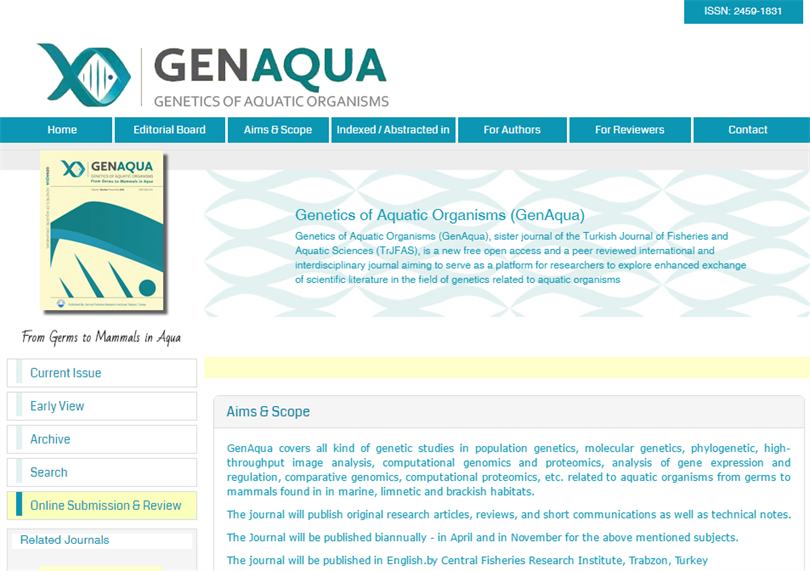 SCI Index'te yer alan "Turkish Journal of Fisheries and Aquatic Sciences" dergimizin kardeş dergisi olan ve ingilizce olarak yılda 2 kez yayınlanacak olan GenAqua dergimiz yayın hayatına başlamıştır. Dergimize ve online makale yönetim sistemine www.genaqua.org adresinden ulaşabilirsiniz.